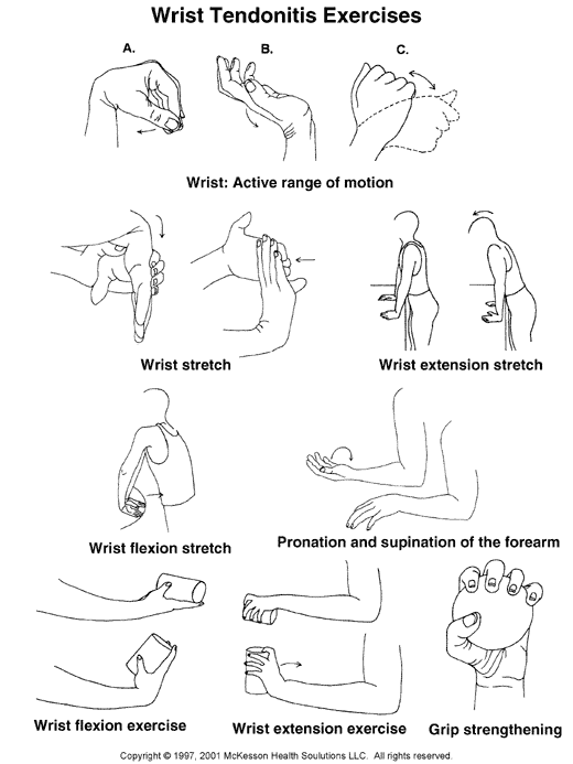Two-way wrist stretch: push your wrist to insufficency both downward and upward.